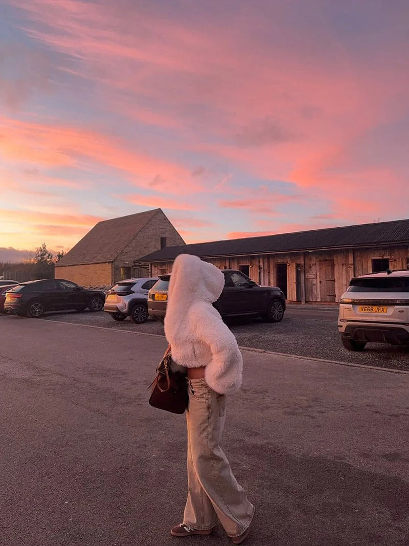 This plush faux fur coat is designed for women seeking ultimate winter luxury and comfort in a statement piece. The coat is made from soft, voluminous faux fur and features an oversized, relaxed fit that easily layers over chunky knits. The attached hood provides extra coverage and warmth, making this coat an essential for staying cozy and stylish in extreme cold.
