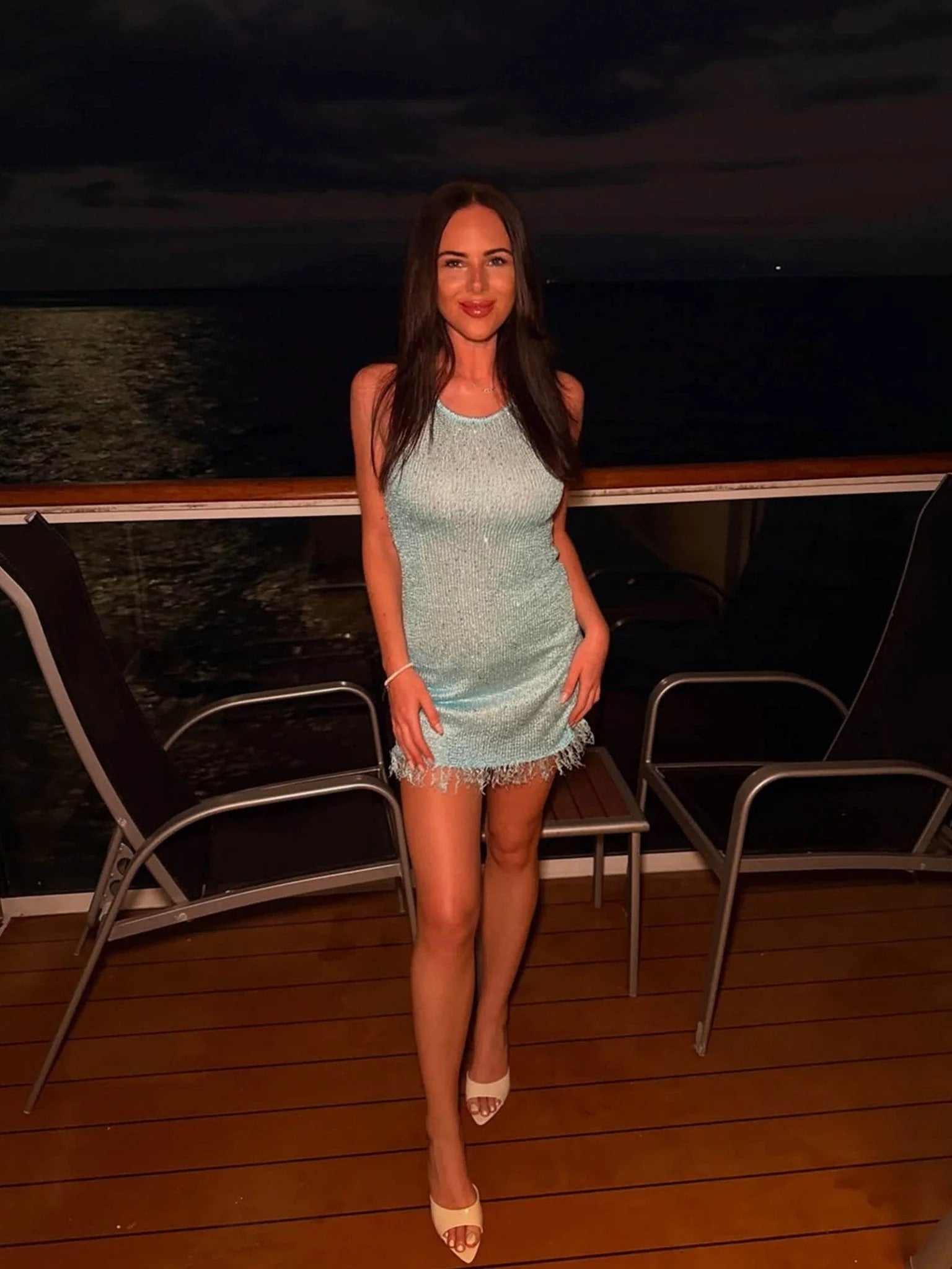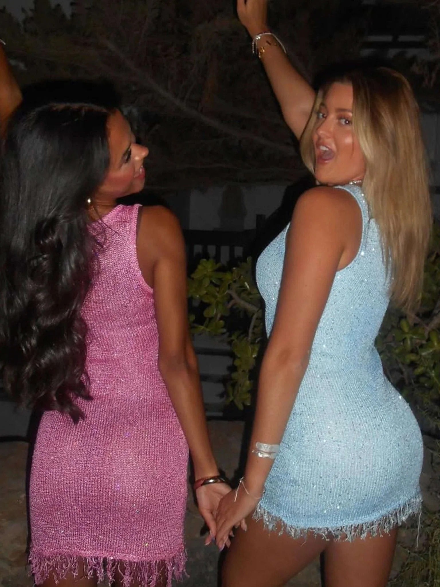 This festive mini dress is designed for women who want a sparkling texture and fun movement for parties and evening events. The dress is crafted from glitter knit material, providing a subtle shimmer and soft feel. It features a decorative fringe hem that adds playful movement, making this short dress a perfect, eye-catching choice for dancing and celebrations.
