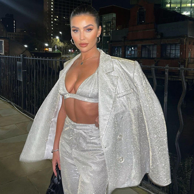 Glitter Set with Wide Leg Trousers, Bralette and Blazer for Women