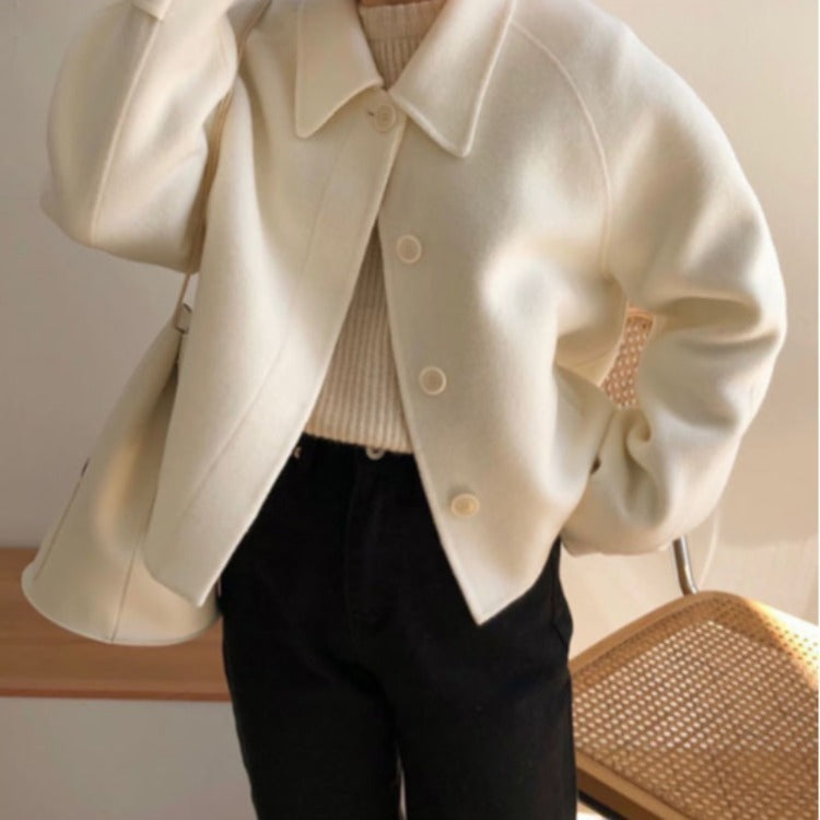 This oversized woolen jacket with a collar for women is designed for a comfortable, relaxed fit. The woolen material provides a soft and warm feel, while the classic collar offers a timeless detail. This jacket is a versatile layer, ideal for adding a cozy yet structured piece to any outfit.