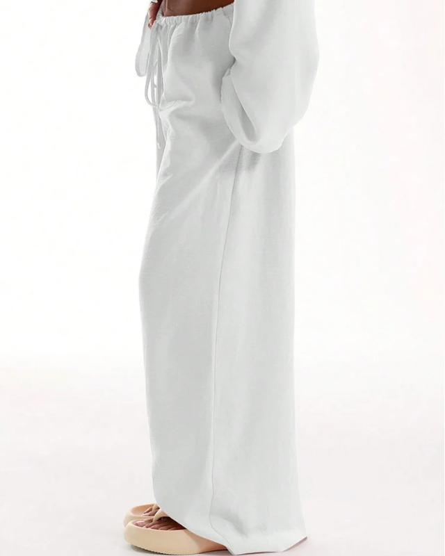 These women's wide leg linen trousers with drawstrings offer a sharp and sophisticated silhouette for women seeking effortless summer elegance. Crafted from linen with a characteristic texture, this piece is defined by its wide-leg cut and an elasticated waistband with an adjustable drawstring for a personalized fit. The minimalist appearance and crisp white color create a timeless aesthetic that exudes a fresh feel during warm weather.